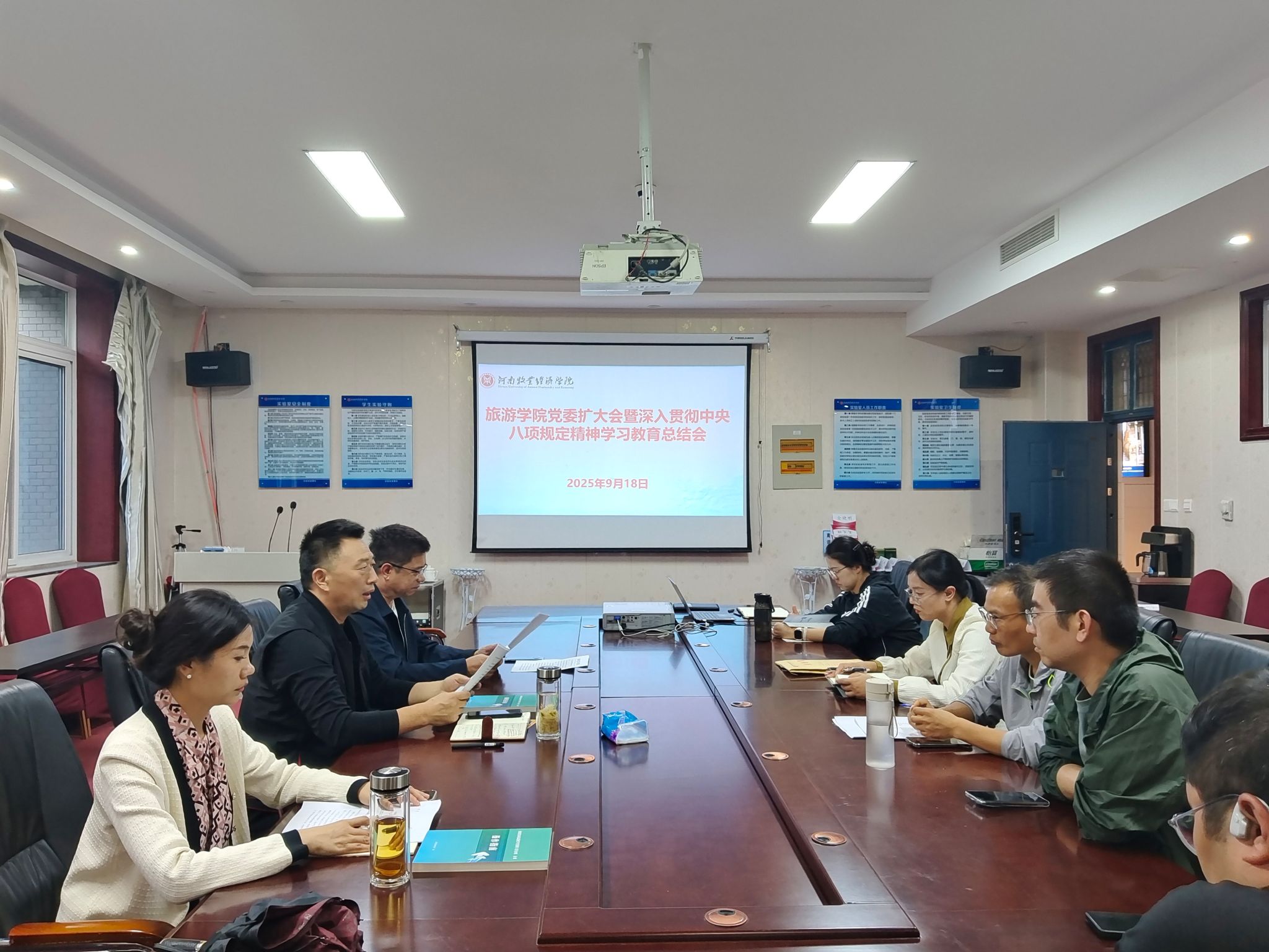 9月18日下午旅游学院在二号楼C423会议室召开深入贯彻中央八项规定精神学习教育总结会全体科级以上干部参加会议会议由学院党委书记权太举主持