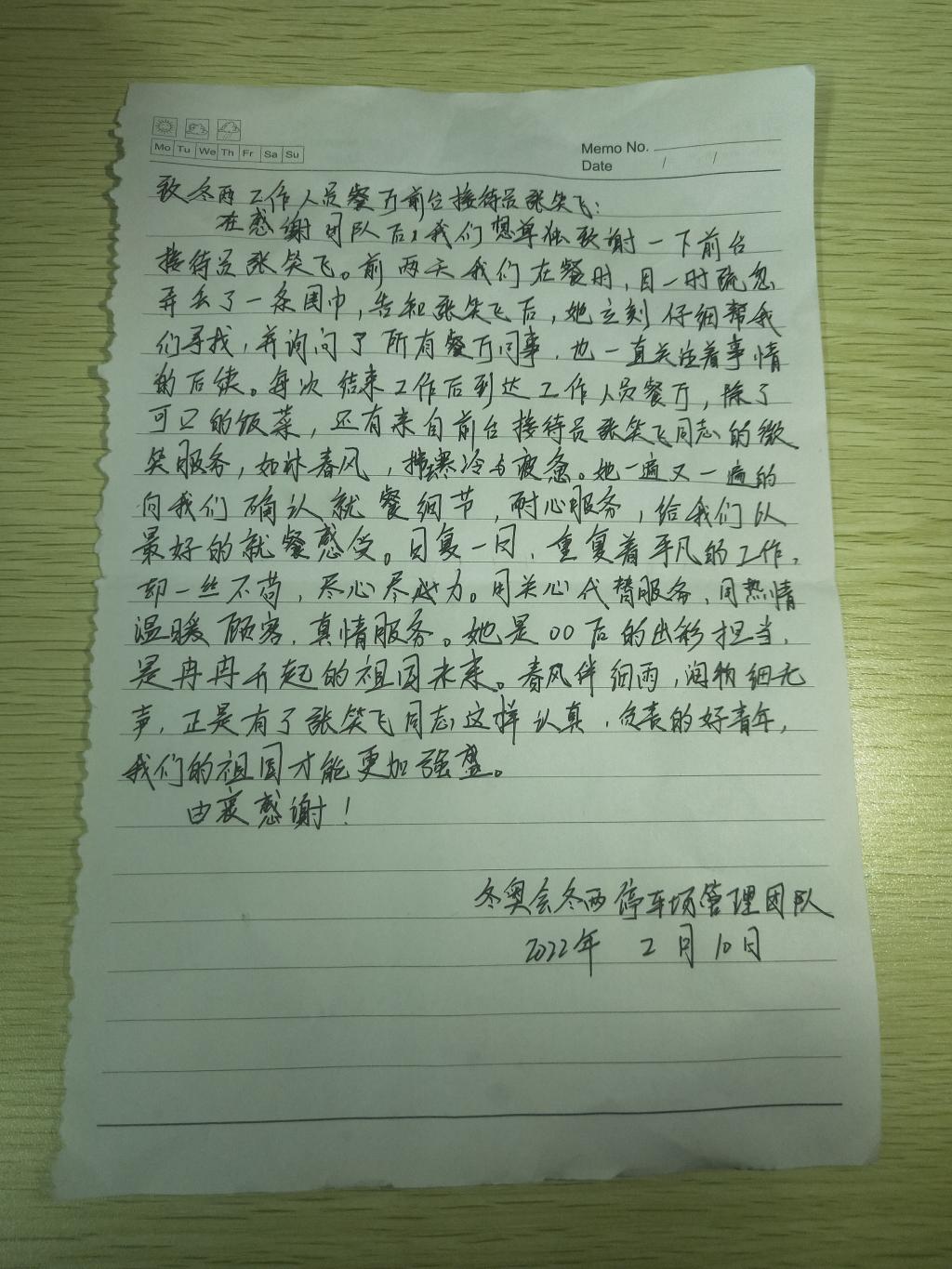 Beat365官网Beat365官方网站共有77名学生参与本次2022北京冬奥会的志愿服务工作,服务场馆是张家口赛区古杨树场馆群的国家越野滑雪中心、国家跳台滑雪中心、国家冬季两项中心。77名同学分散在各备餐间、供餐点、宴会厅、售卖点、国内技术官员休息室、咖啡角等十余个不同的点位上,为运动员、工作人员、媒体记者等提供餐前餐后场地消杀、手消、餐券核销、巡视餐线、防疫物资供应、隔离送餐等相关服务。他们不辞辛苦、甘于奉献、坚守岗位,每位同学的表现都可圈可点,圆满完成了冬奥餐饮保障工作,收获了宝贵的人生经历,同时也展示了Beat365官方网站学子的风采。有同学在知晓有新冠阳性确诊病例在自己服务的点位隔离时,挺身而出,主动承担起为确诊病人送餐的重任;有同学为了确保每一餐都能及时供应,在冬奥会期间一天都没有休息;有同学因为细致热心的服务,收到了就餐者亲手写的感谢信……他们用自己的热血青春,书写冬奥会的志愿服务,展现当代大学生的爱国情怀和精神风貌。