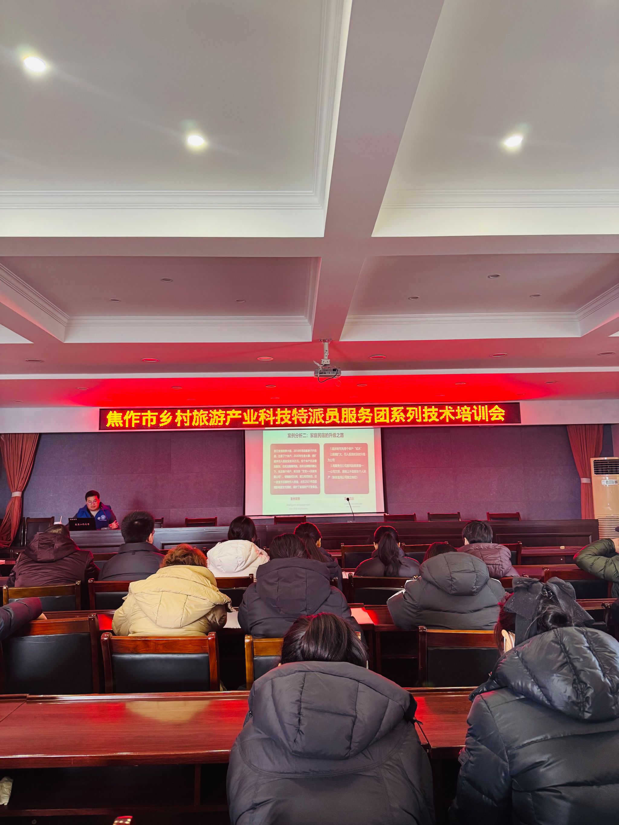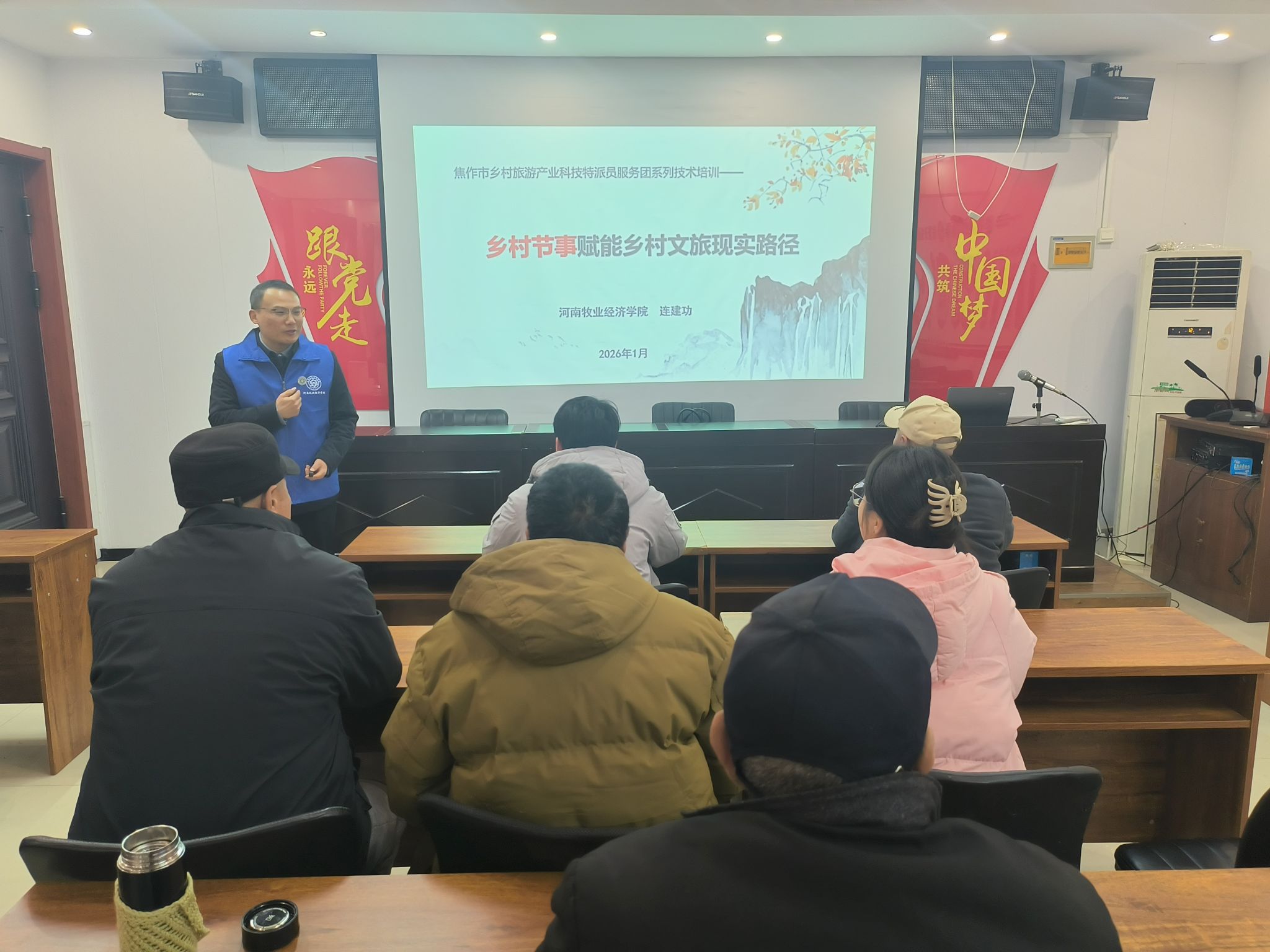 为深化乡村振兴战略实施,助力焦作市解放区乡村旅游产业高质量发展,1月28日下午,Beat365官方网站院长王中雨带领乡村旅游产业科技特派员服务团一行4人赴焦作市解放区开展专题技术培训。当地文旅从业者、基层干部及村民代表参加培训,现场反响热烈。