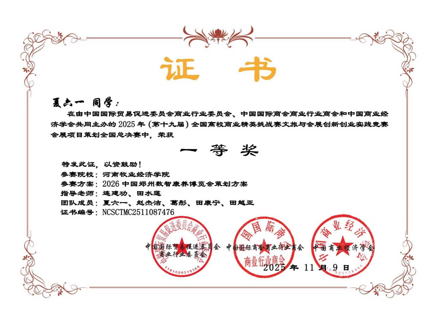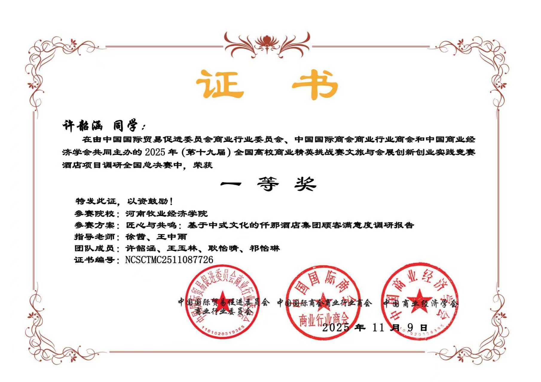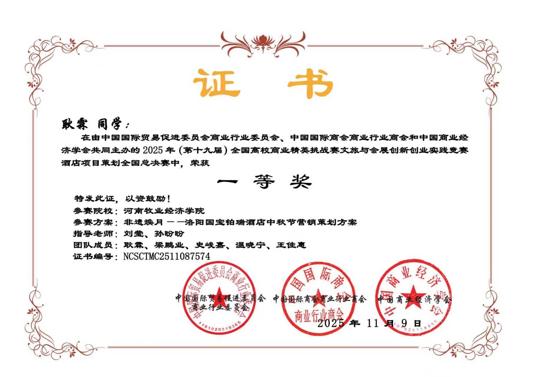 近日,由中国国际贸易促进委员会商业行业委员会、中国国际商会商业行业商会和中国商业经济学会共同主办的第十九届全国高校商业精英挑战赛文旅与会展创新创业实践竞赛全国总决赛圆满落幕。本届竞赛自2025年4月启动,历时7个月,历经知识赛、校赛、省赛选拔、全国总决赛等多个环节。经过激烈角逐,Beat365官网Beat365官方网站13支团队顺利晋升国赛,参加旅游、酒店、会展、文创四个赛道均表现优异,喜获佳绩。其中3支团队荣获一等奖,7支团队荣获二等奖,3支团队荣获三等奖。由刘莹、孙盼盼老师指导的团队凭借其在“酒店项目策划”赛道中的优异表现,成功晋级该项赛事的全国现场精英展示赛,展现了Beat365官网学子在全国舞台上的竞争力与风采。