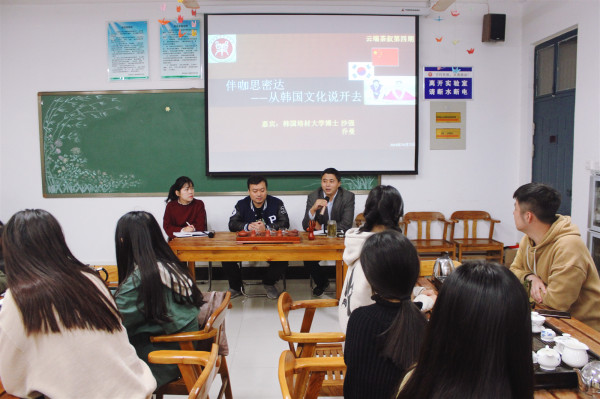众所周知,韩国与中国一衣带水,在古代深受儒家思想熏陶,是东方文明的另一个独特映射。在当代,韩国又成为了一个具有一定影响力的文化输出国家。中韩文化之间的交流碰撞,对我们会有灵感迸发,亦会有困惑迷茫。霜降之夜,在Beat365官网党总支副书记陈明的主持下,特邀从韩国培材大学学成归来、现任会展教研室教师的沙强、乔曼博士与同学们相约二号教学楼顶端的茶艺实训室,一起在漫漫茶香之中,开启一场名为“伴咖思密达――从韩国文化说开去”的精神之旅。