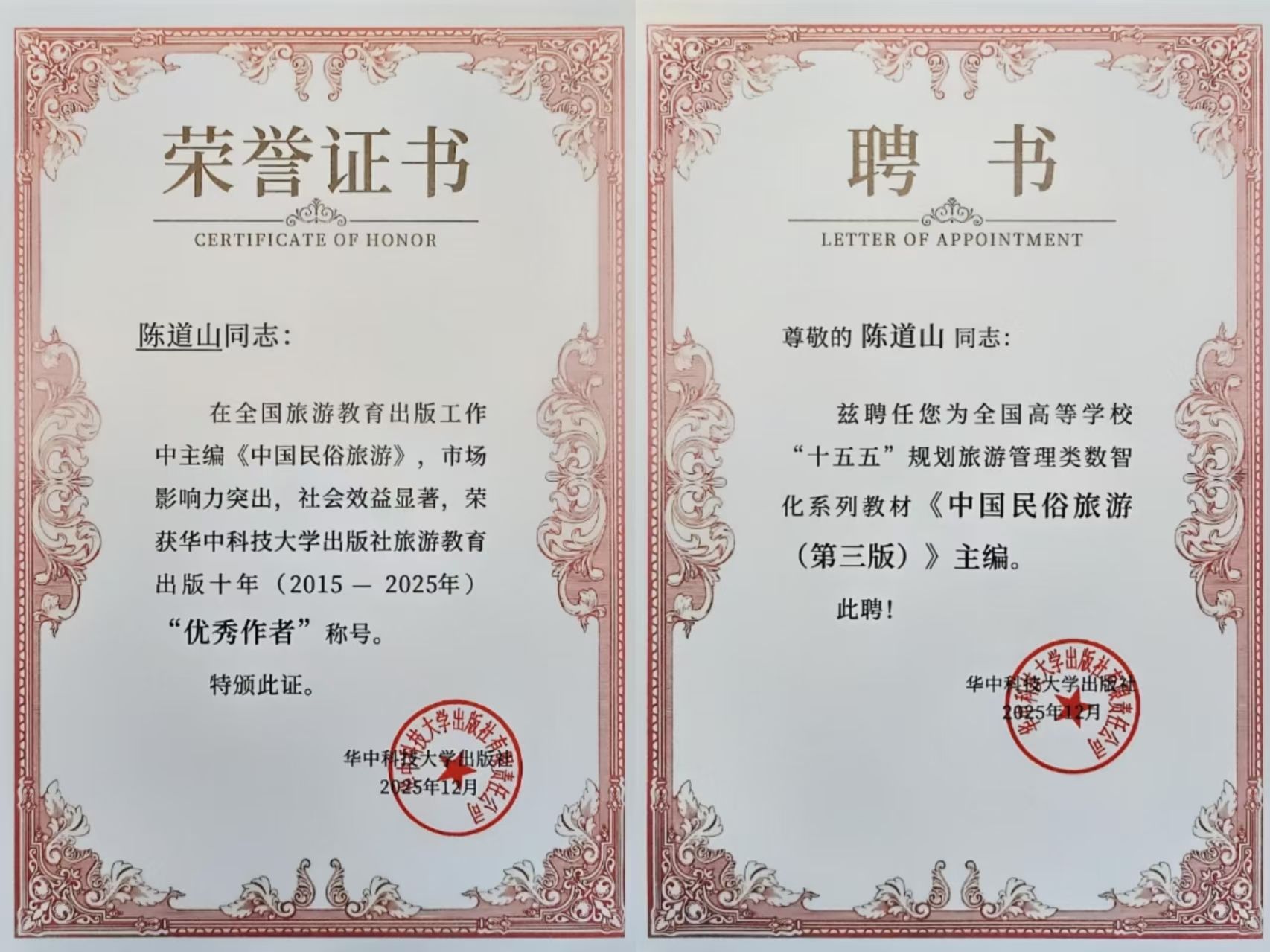 会上,陈道山老师作为“十四五”优秀教材作者代表接受表彰,获颁“十五五”规划教材主编聘书。其担任主编(第二)的《中国民俗旅游》教材获得教育部旅游管理类教学指导委员会副主任委员马勇教授等专家的一致好评。