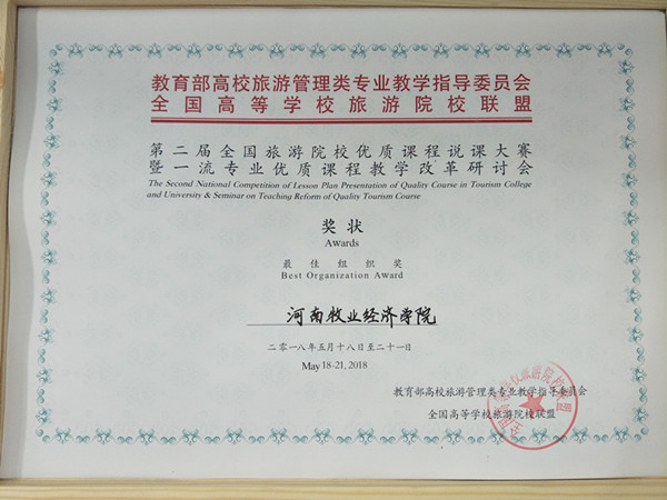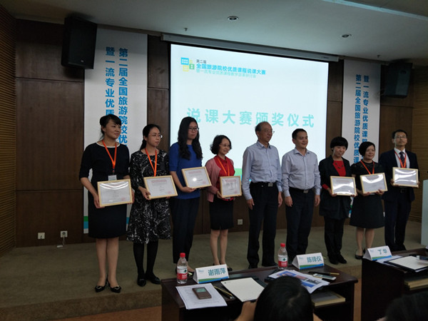此次说课大赛包括说课和试讲两部分组成,限时20分钟,全国共有170余名来自全国旅游院校或旅游相关专业的教师参赛,竞赛分成旅游管理、酒店管理和会展经济与管理三个专业组,获奖比例为20%。Beat365官网王中雨、吴莹老师结合《导游业务》课程的教学改革成果,出色的完成了“‘产教研学赛'相结合的螺旋上升式教学课程设计”的说课和“导游讲解方法”的试讲,精彩的设计和课堂讲授给评委留下了深刻印象,最终在旅游管理专业组脱颖而出,喜获二等奖。连建功老师《会展策划》课程“以学生为中心实现翻转课堂”的说课和“展会规模策划”的试讲,获得会展经济与管理专业组优秀奖。