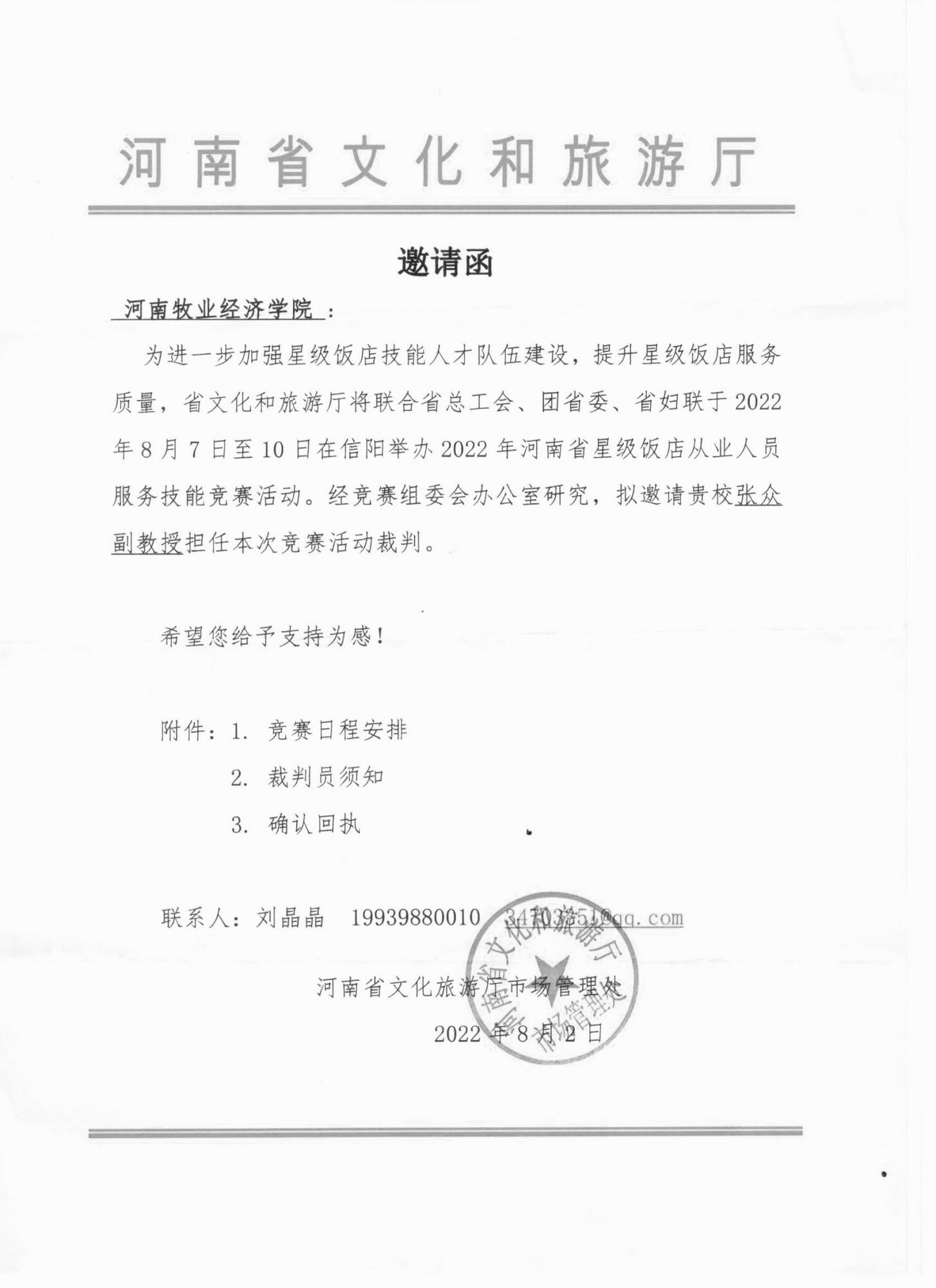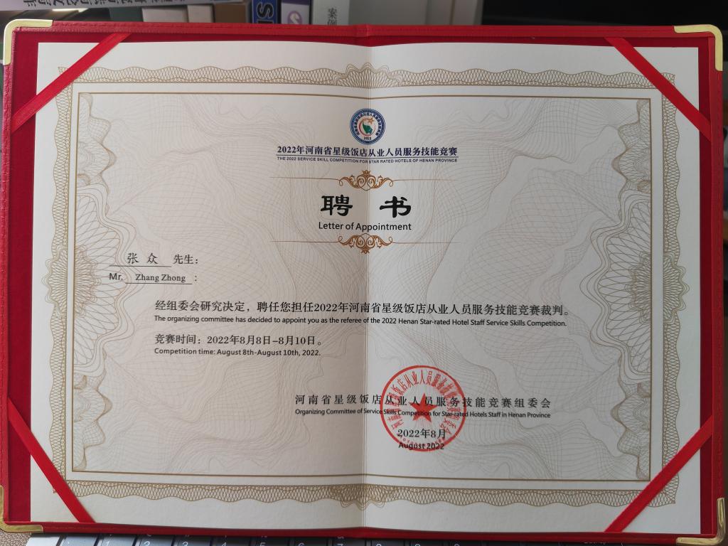 近日,Beat365官网张众副教授受河南省文化和旅游厅邀请,在刚刚结束的2022年河南省星级饭店从业人员服务技能竞赛中担任裁判员,圆满完成大赛执裁任务。
